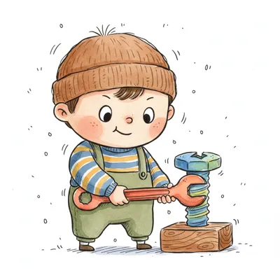 Cartoon-Junge mit Mütze und Latzhose schraubt mit einem Schraubenschlüssel an einer großen Schraube.