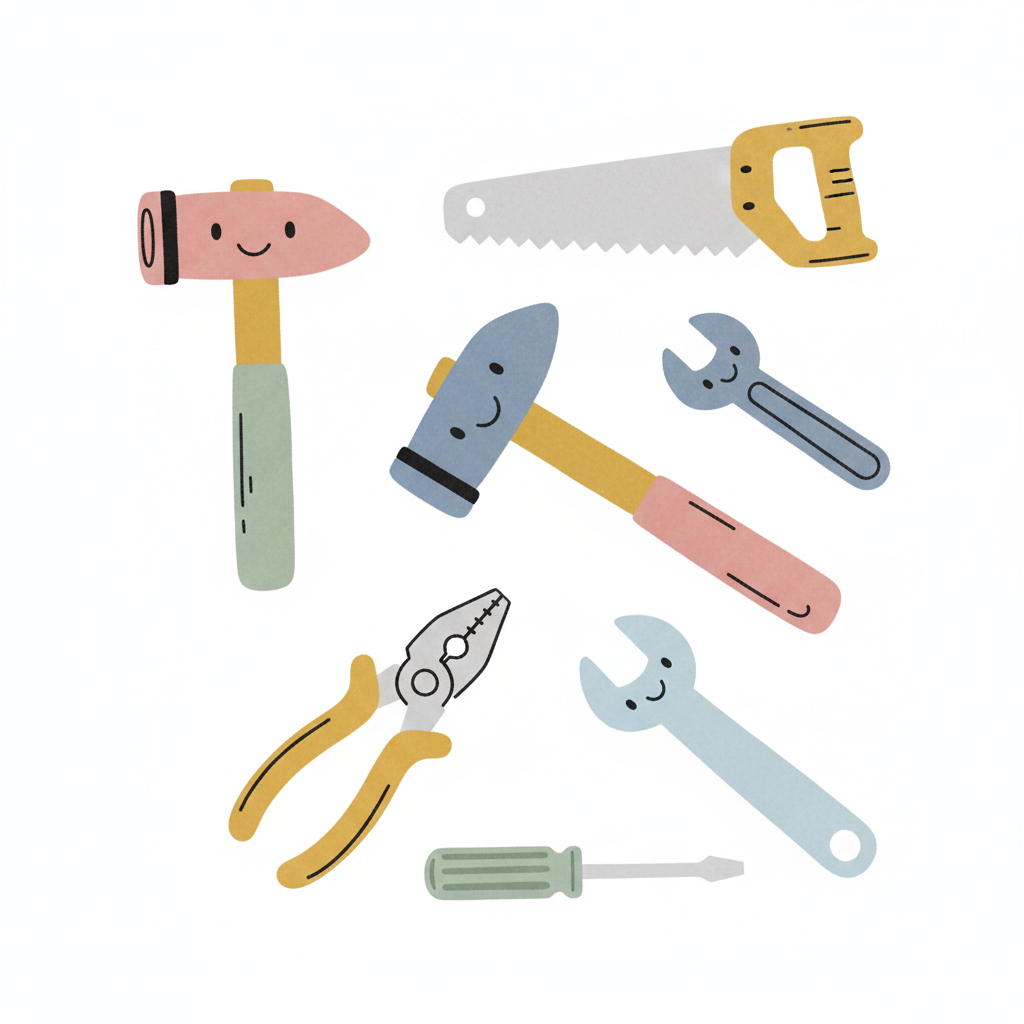 Niedliche, lächelnde Werkzeuge in Pastellfarben: Hämmer, Säge, Schraubenschlüssel, Zange, Schraubendreher.