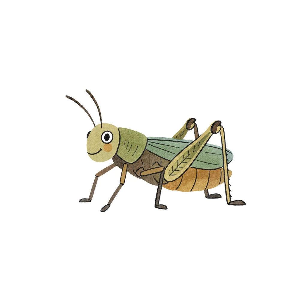 Eine cartoonhafte Heuschrecke mit fröhlichem Gesicht.