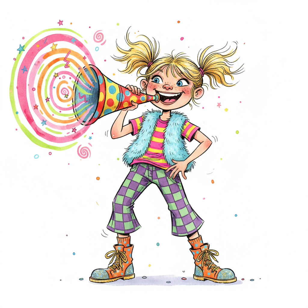 Fröhliches Cartoon-Mädchen mit Zöpfen und Megafon, das bunte Wirbel und Sterne erzeugt.