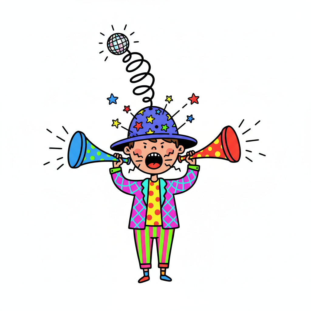 Buntes Cartoon-Kind in Partykleidung mit Sternen-Hut, Disco-Kugel und lauten Tröten.