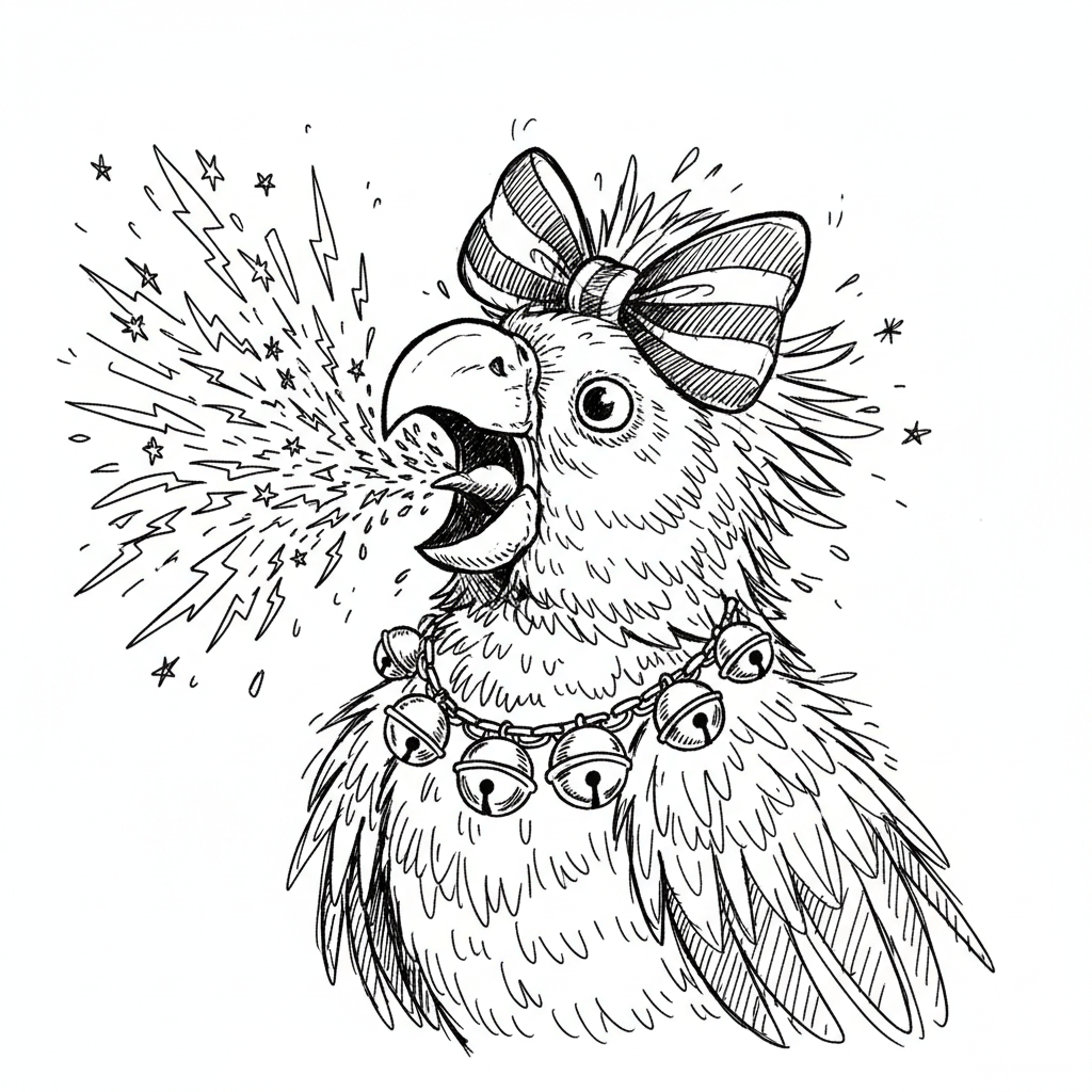 Ein Papagei mit Schleife und Glöckchen schreit laut, Sterne und Blitze kommen aus seinem Schnabel.