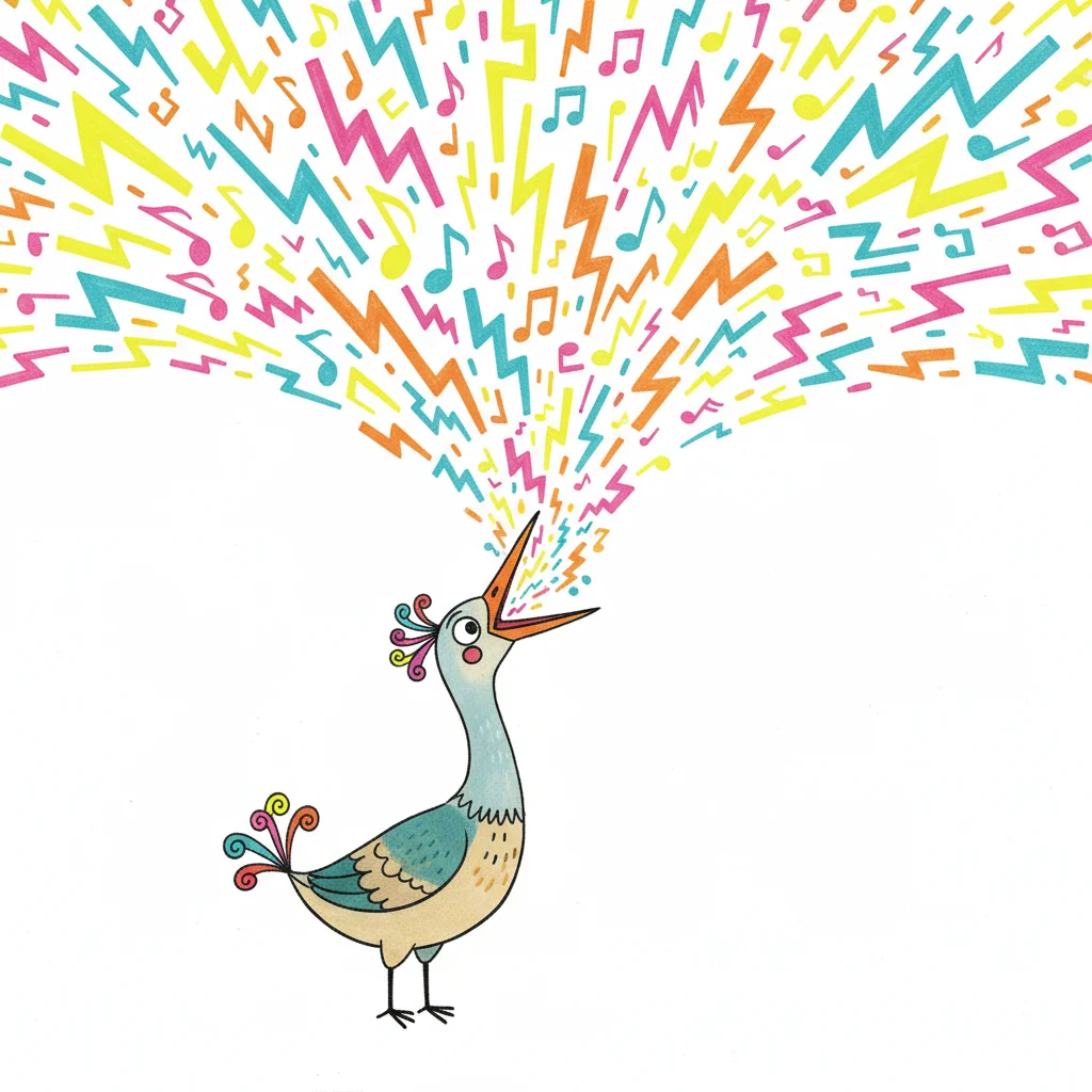 Bunter Cartoon-Vogel singt laut, Noten und Blitze sprühen aus seinem Schnabel.