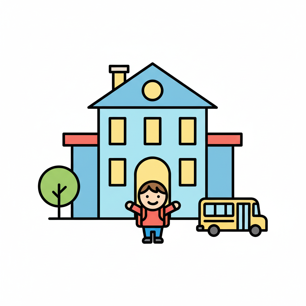 Buntes Icon: Kind vor Schule mit Rucksack, Baum und Schulbus. Bildung und Schulanfang.