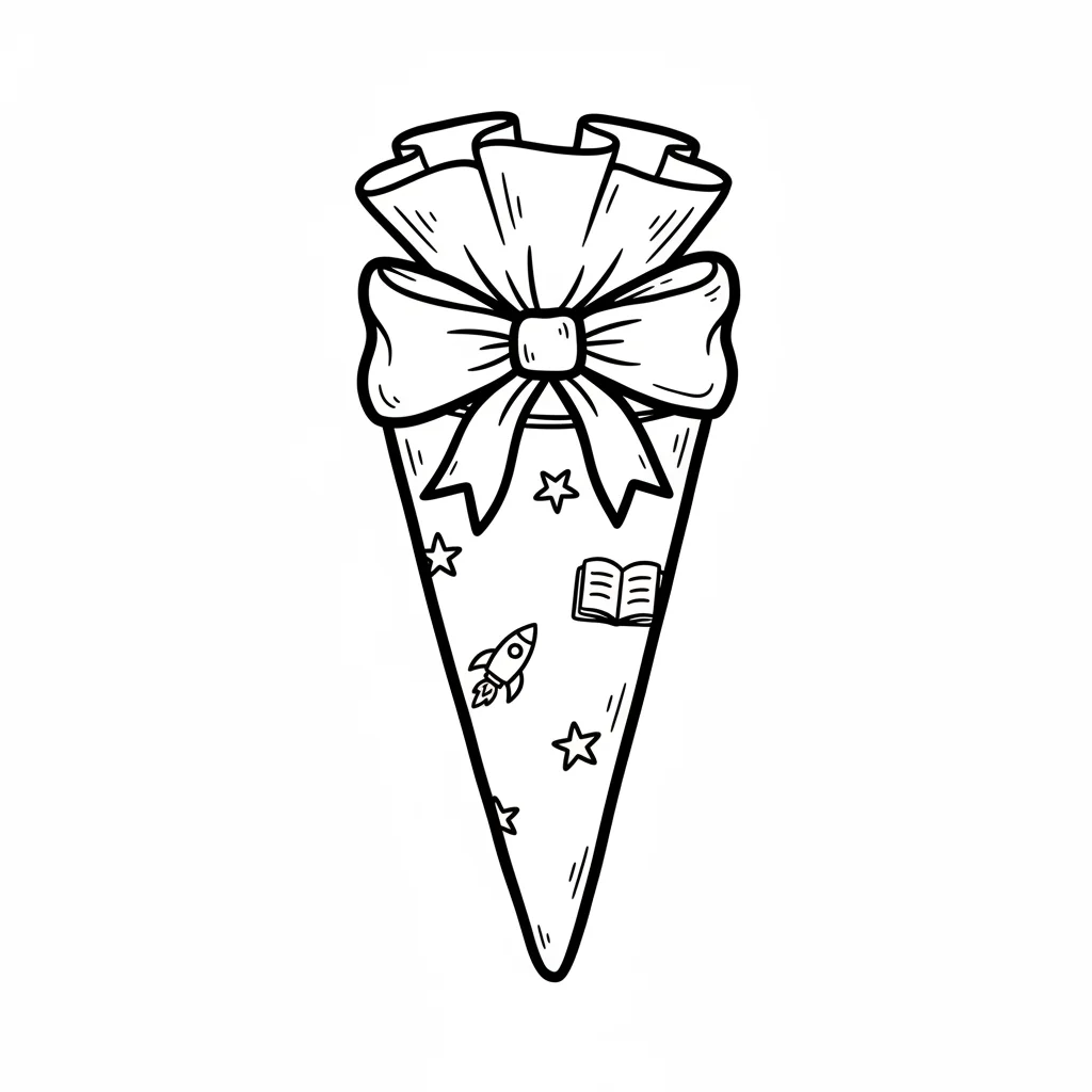 Schwarz-weiße Strichzeichnung einer Schultüte mit Schleife, Rakete, Buch und Sternen.
