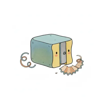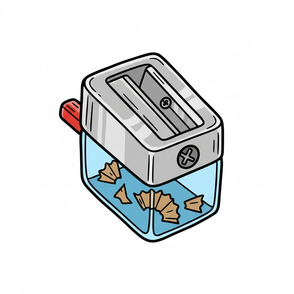 Gezeichneter Bleistiftspitzer mit transparentem Behälter voller Holzspäne.
