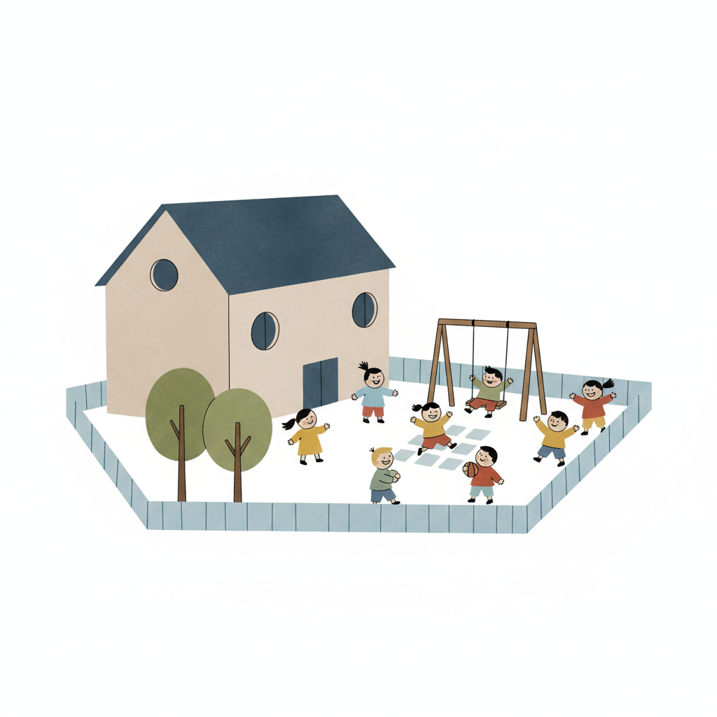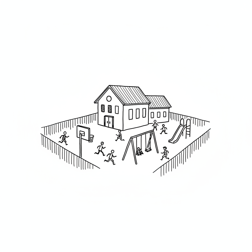 Strichzeichnung eines Schulhofs mit spielenden Kindern, Schaukel, Rutsche und Basketballkorb.