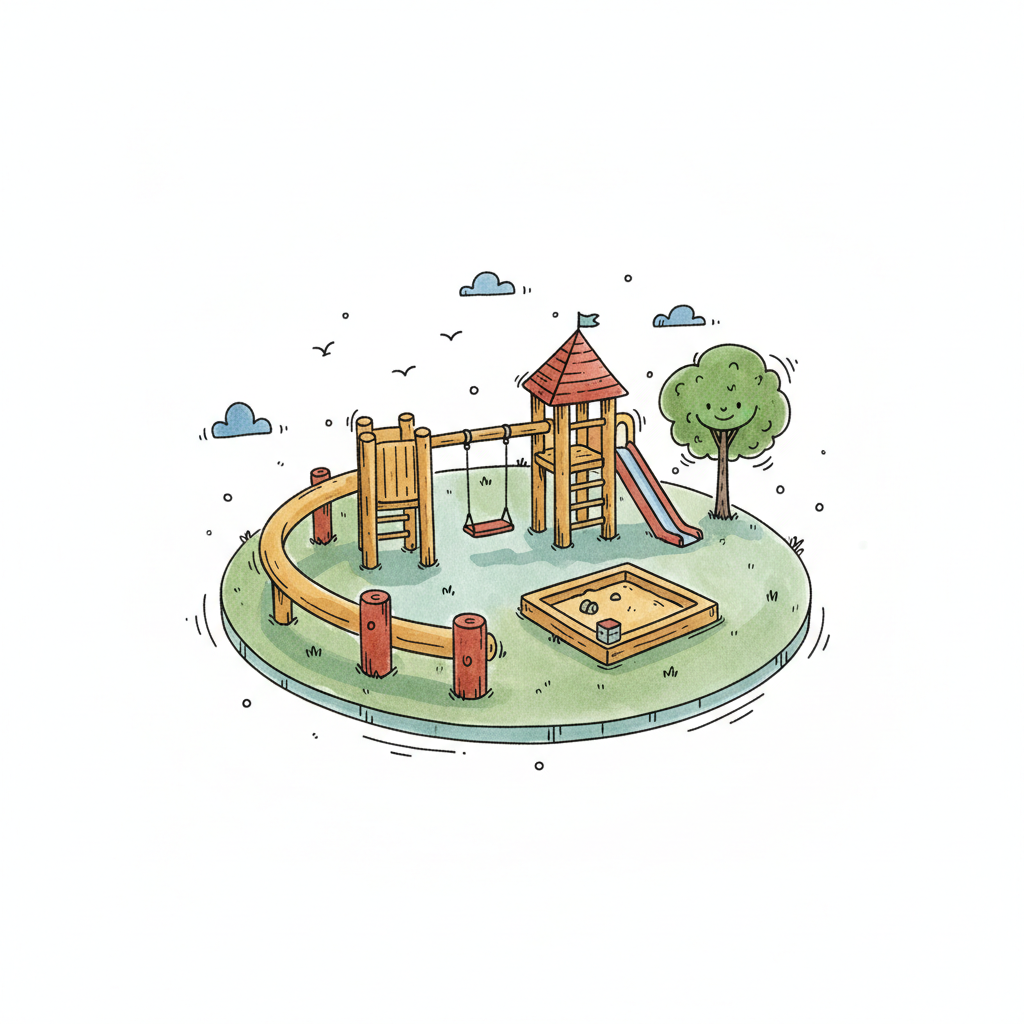 Bunte Illustration eines Spielplatzes mit Rutsche, Schaukeln, Sandkasten und einem lächelnden Baum.