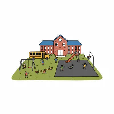 Kinder spielen auf einem Schulhof mit Schulgebäude, Bus, Schaukeln, Rutsche und Basketballplatz.