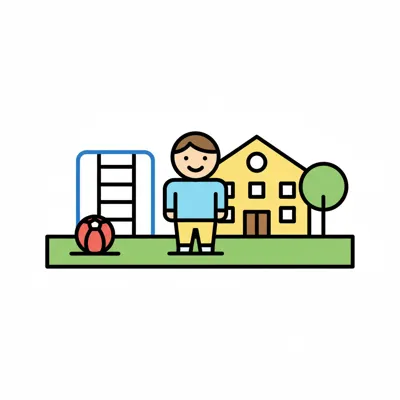 Ein lächelndes Kind steht vor einem Haus mit Klettergerüst und Ball auf einer grünen Wiese.