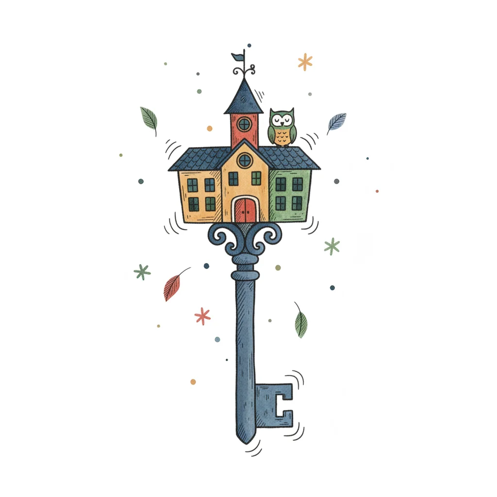 Ein Schlüssel mit einem bunten Haus und einer Eule, umgeben von bunten Blättern.