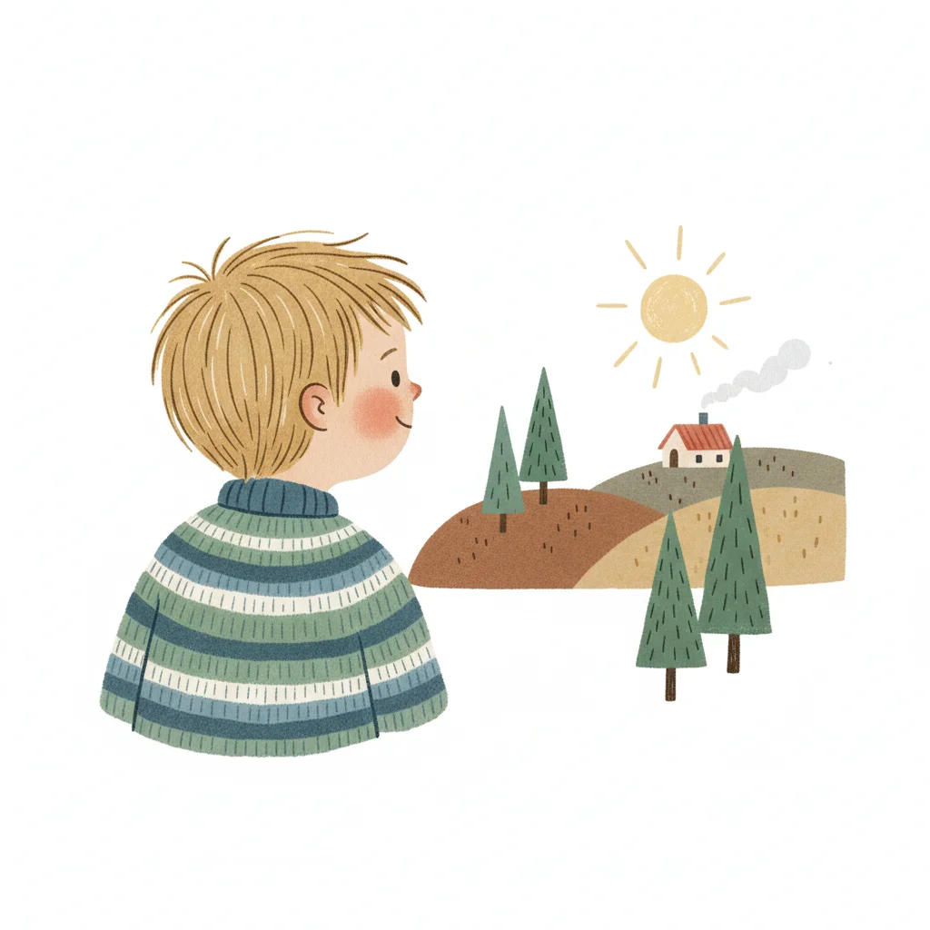 Niedliche Illustration: Ein Junge schaut auf ein Haus in einer Hügellandschaft mit Bäumen und Sonne.