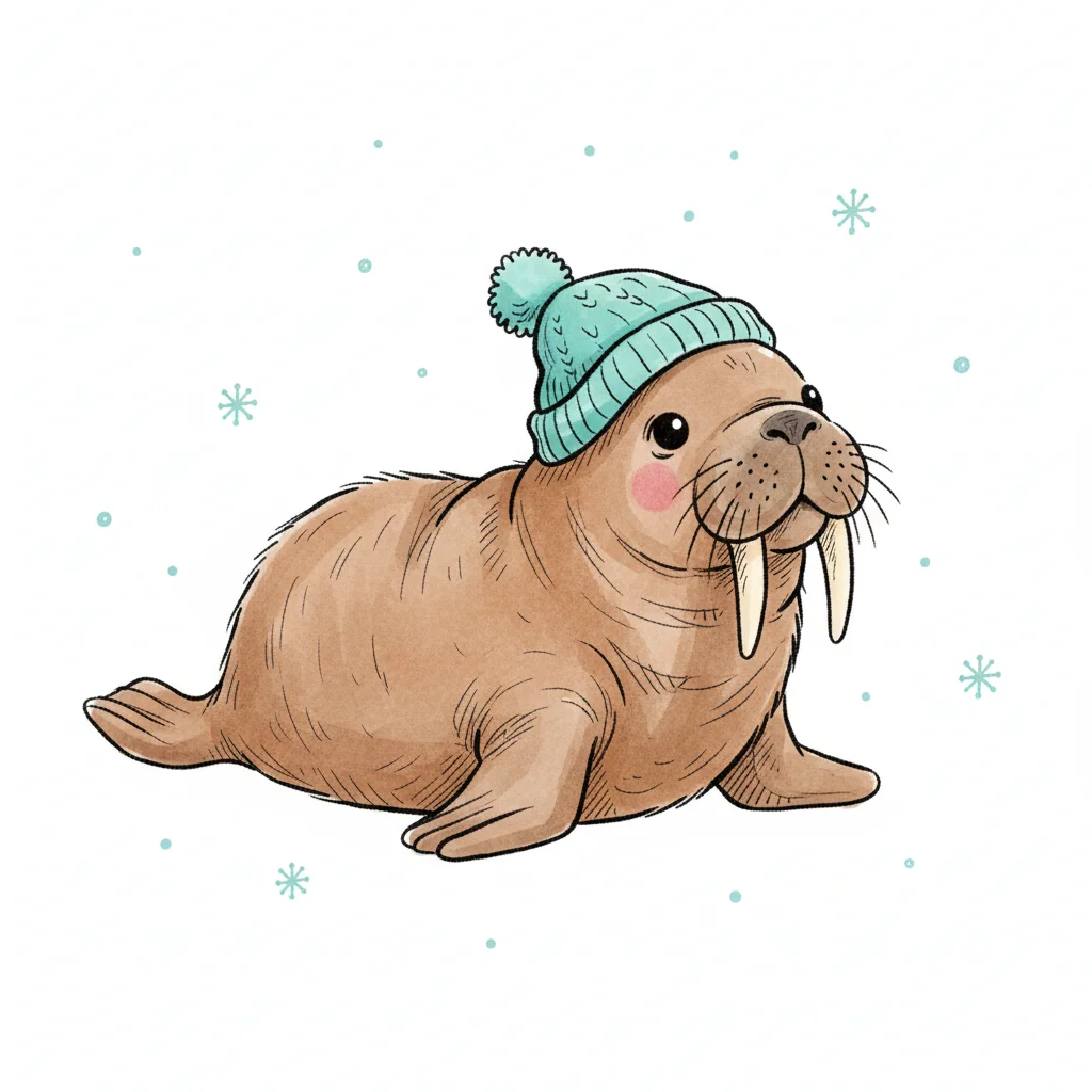 Illustration eines niedlichen Walrosses mit blauer Wintermütze und rosigen Wangen, umgeben von Schneeflocken.