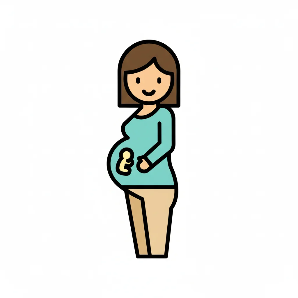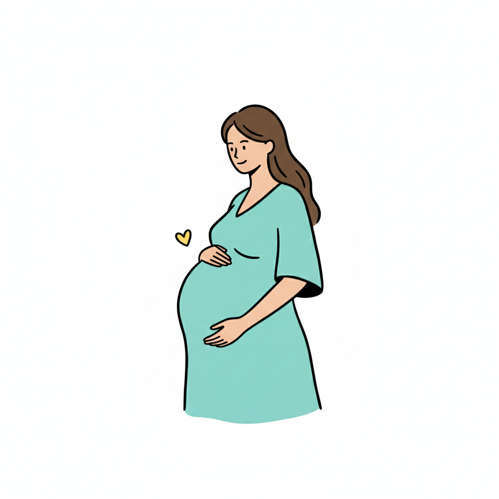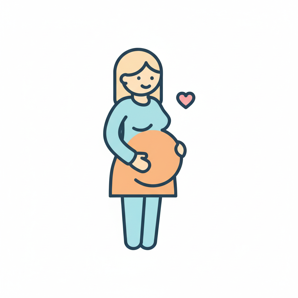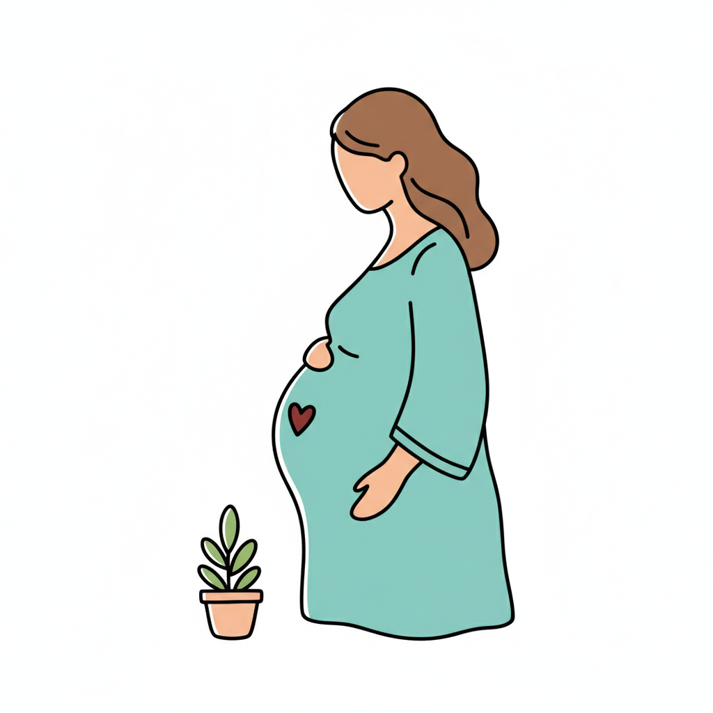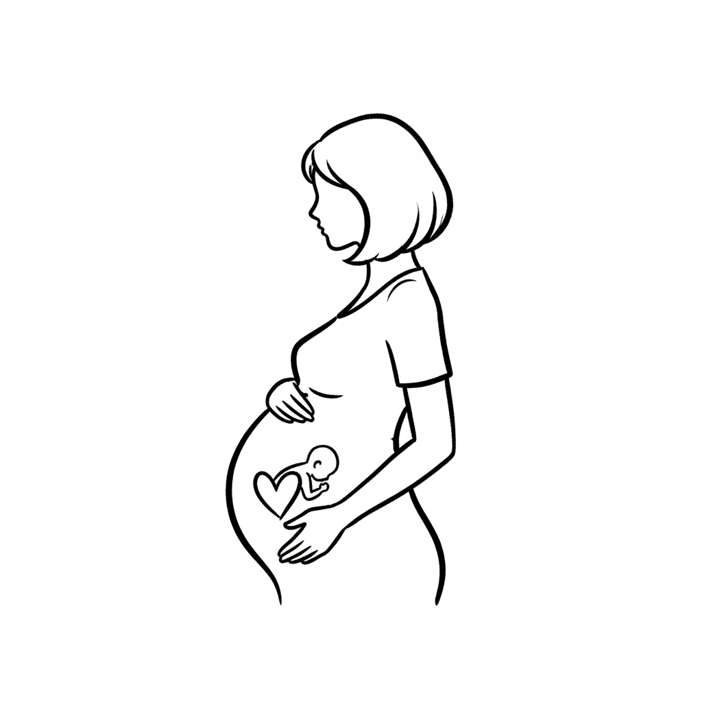 Stilisierte Zeichnung einer schwangeren Frau, die ihren Bauch hält, mit Fötus und Herz.