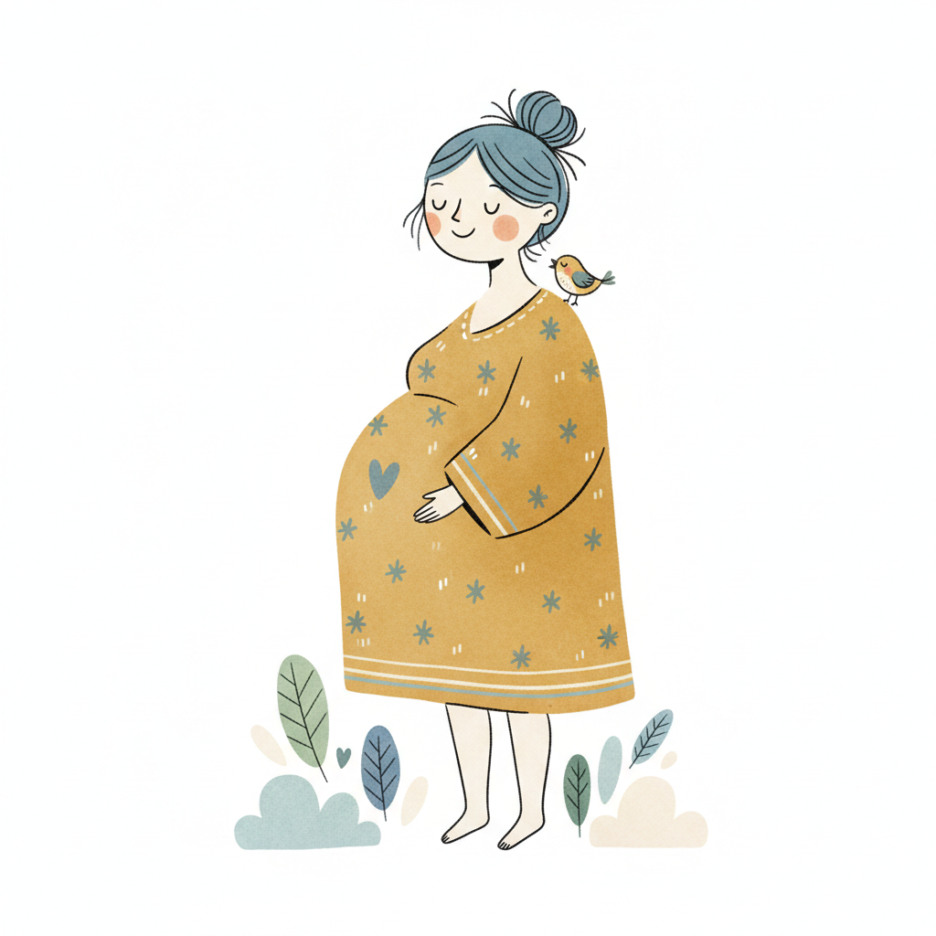 Illustration einer lächelnden schwangeren Frau mit Vogel auf der Schulter und Herz auf dem Bauch.