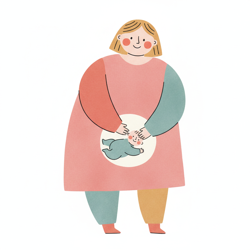 Farbige Illustration einer lächelnden Frau, die liebevoll ein Baby in ihrem Bauch hält.