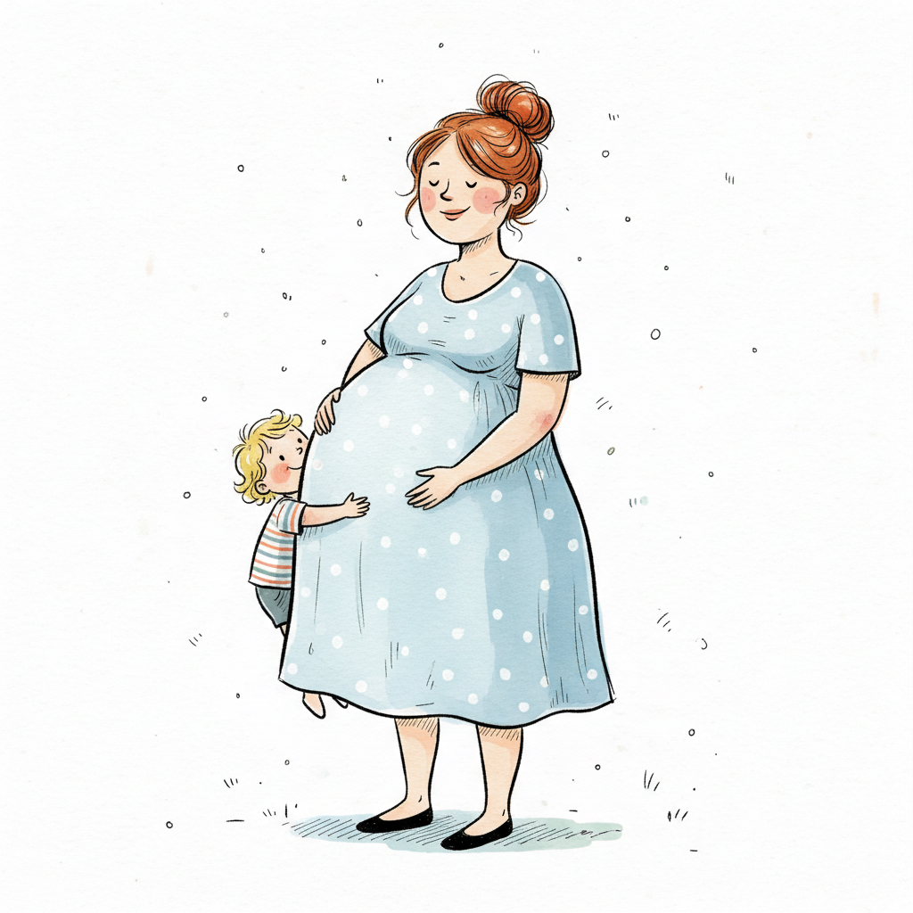 Illustration einer schwangeren Frau, die ihren Bauch hält, in dem ein Baby friedlich schläft.
