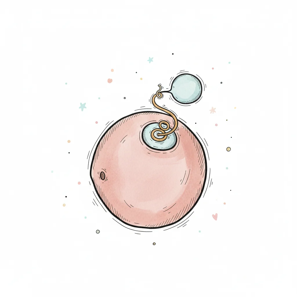 Niedliche Aquarell-Illustration einer rosa Kugel mit Nabelschnur und Fruchtblase, umgeben von Sternen.