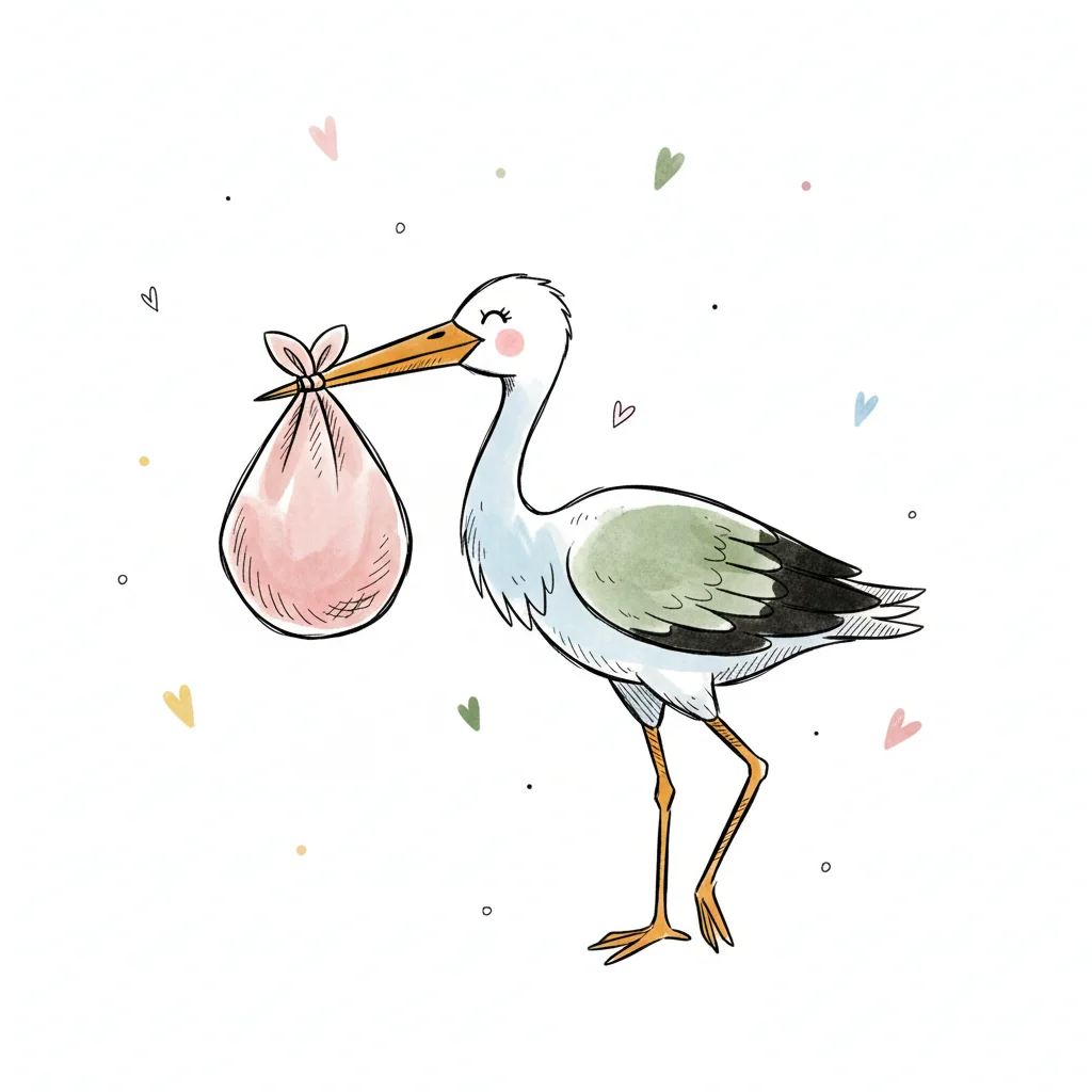 Ein lächelnder Storch trägt ein rosa Babybündel im Schnabel, umgeben von kleinen Herzen.