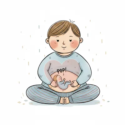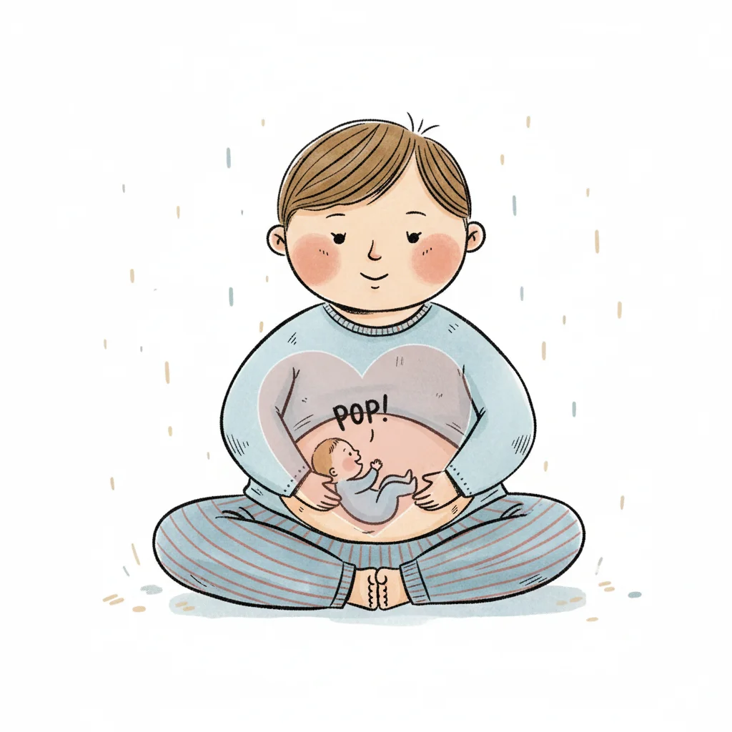 Niedliche Illustration: Eine Person sitzt mit offenem Bauch, in dem ein Baby mit "POP!" zu sehen ist.
