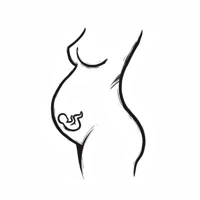 Schwarz-Weiß-Strichzeichnung einer schwangeren Frau mit Fötus im Bauch.