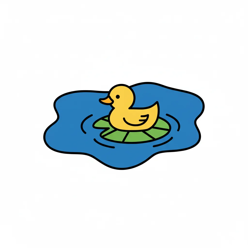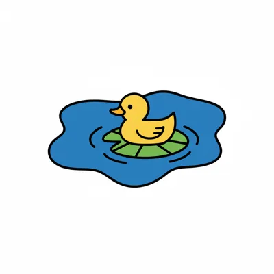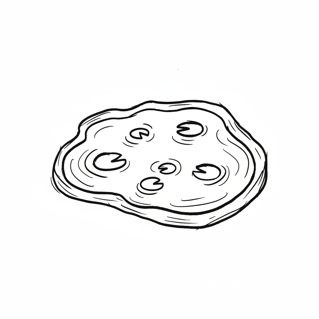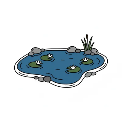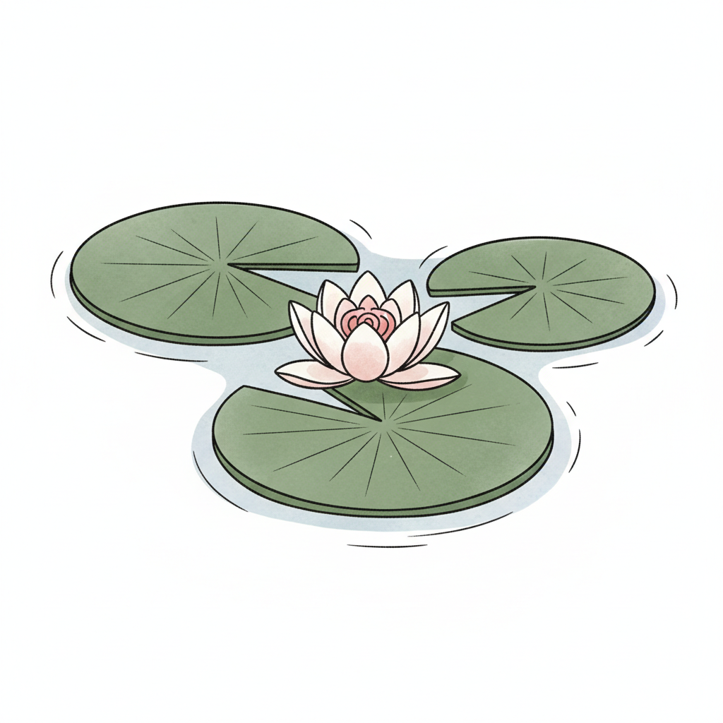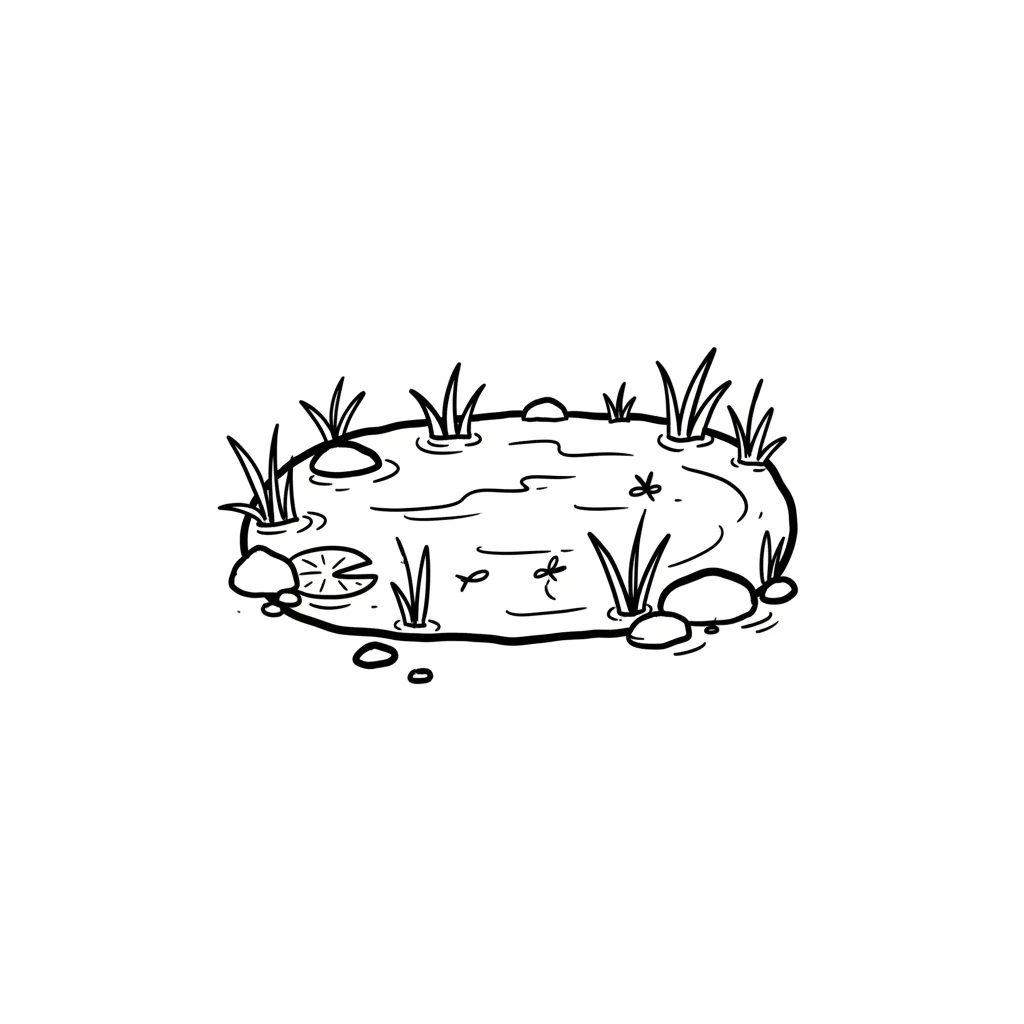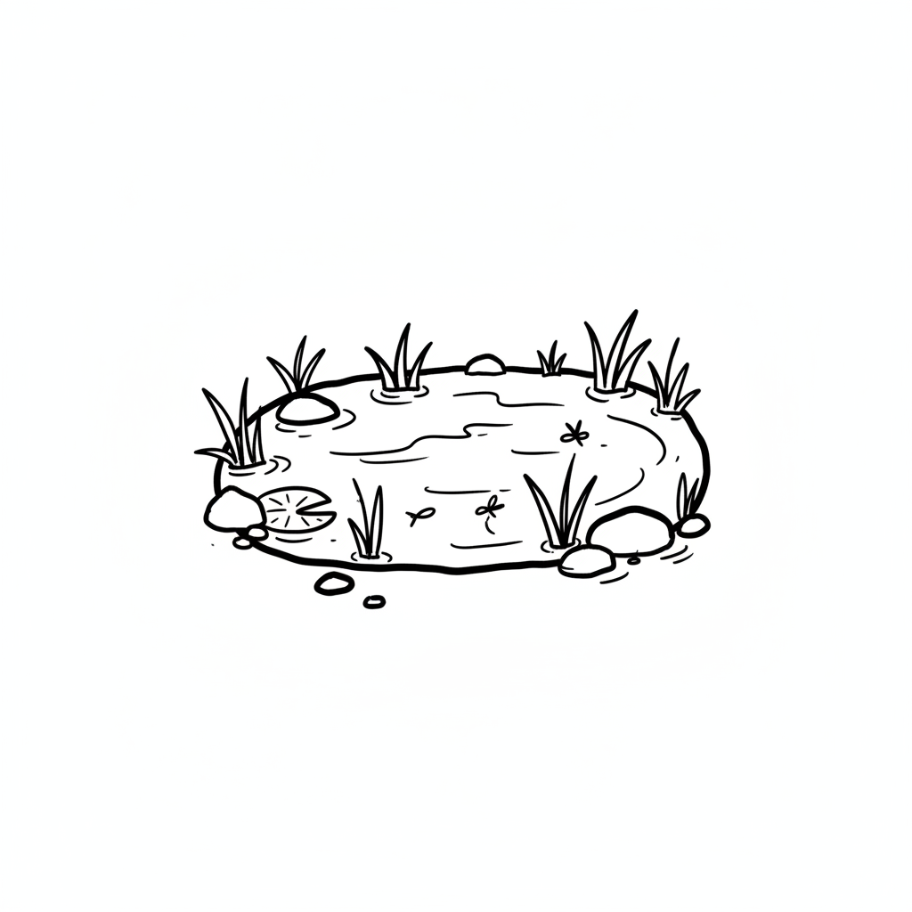 Eine einfache Schwarz-Weiß-Zeichnung eines kleinen Teichs mit mehreren Seerosenblättern und Wellen.