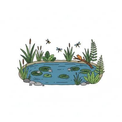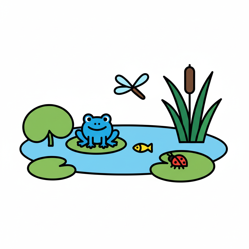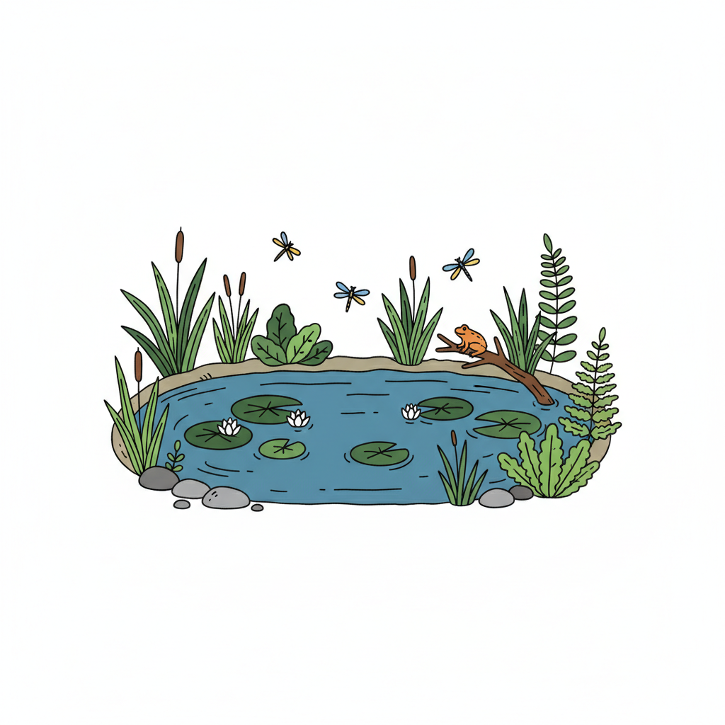 Cartoonzeichnung eines kleinen Teichs mit Gräsern, Steinen, Seerose, Insekten und Fisch.