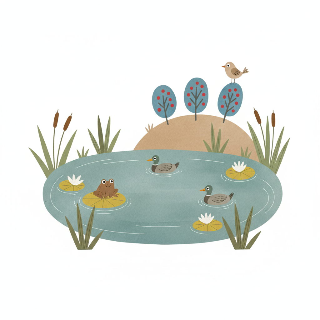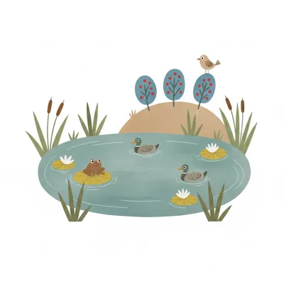 Bunte Illustration eines Teichs mit Frosch auf Seerose, schwimmenden Enten und einem Vogel.