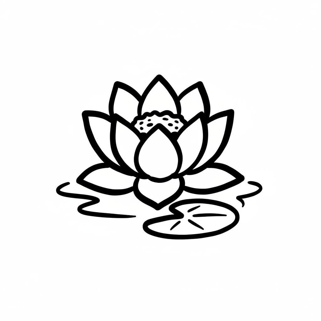 Stilisierte Schwarz-Weiß-Zeichnung einer Lotusblume und eines Seerosenblattes auf Wasser.