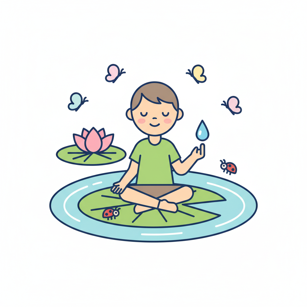 Cartoon-Junge meditiert auf Seerose, hält Wassertropfen, umgeben von Schmetterlingen und Marienkäfern.