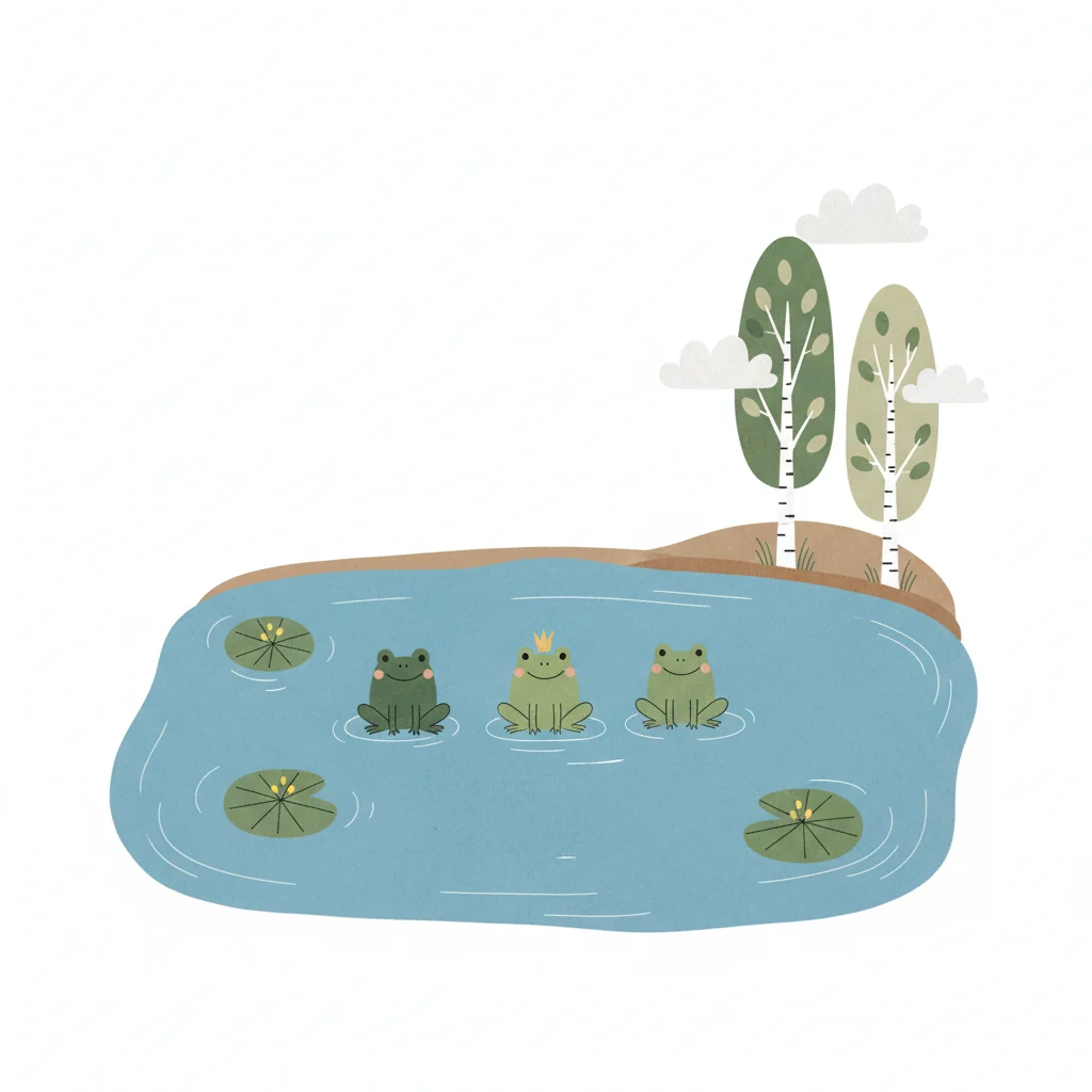 Drei niedliche Cartoon-Frösche, einer mit Krone, schwimmen in einem Teich mit Seerosen und Bäumen.
