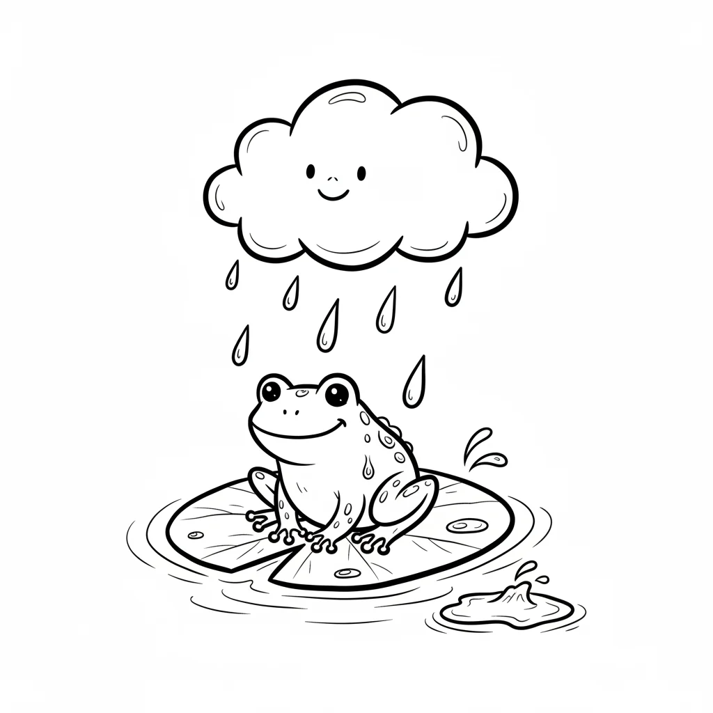 Ein lächelnder Frosch sitzt auf einem Seerosenblatt, während eine fröhliche Wolke auf ihn regnet.