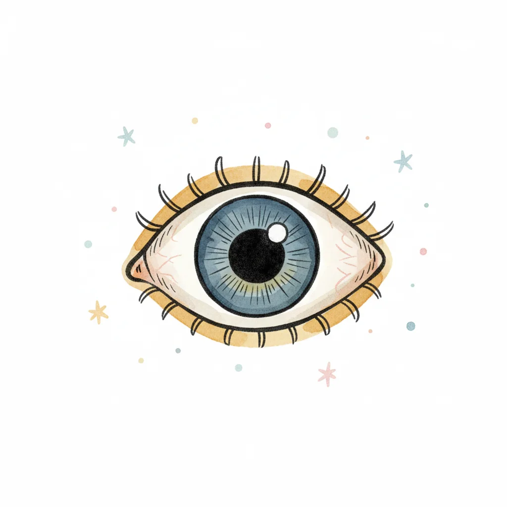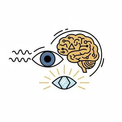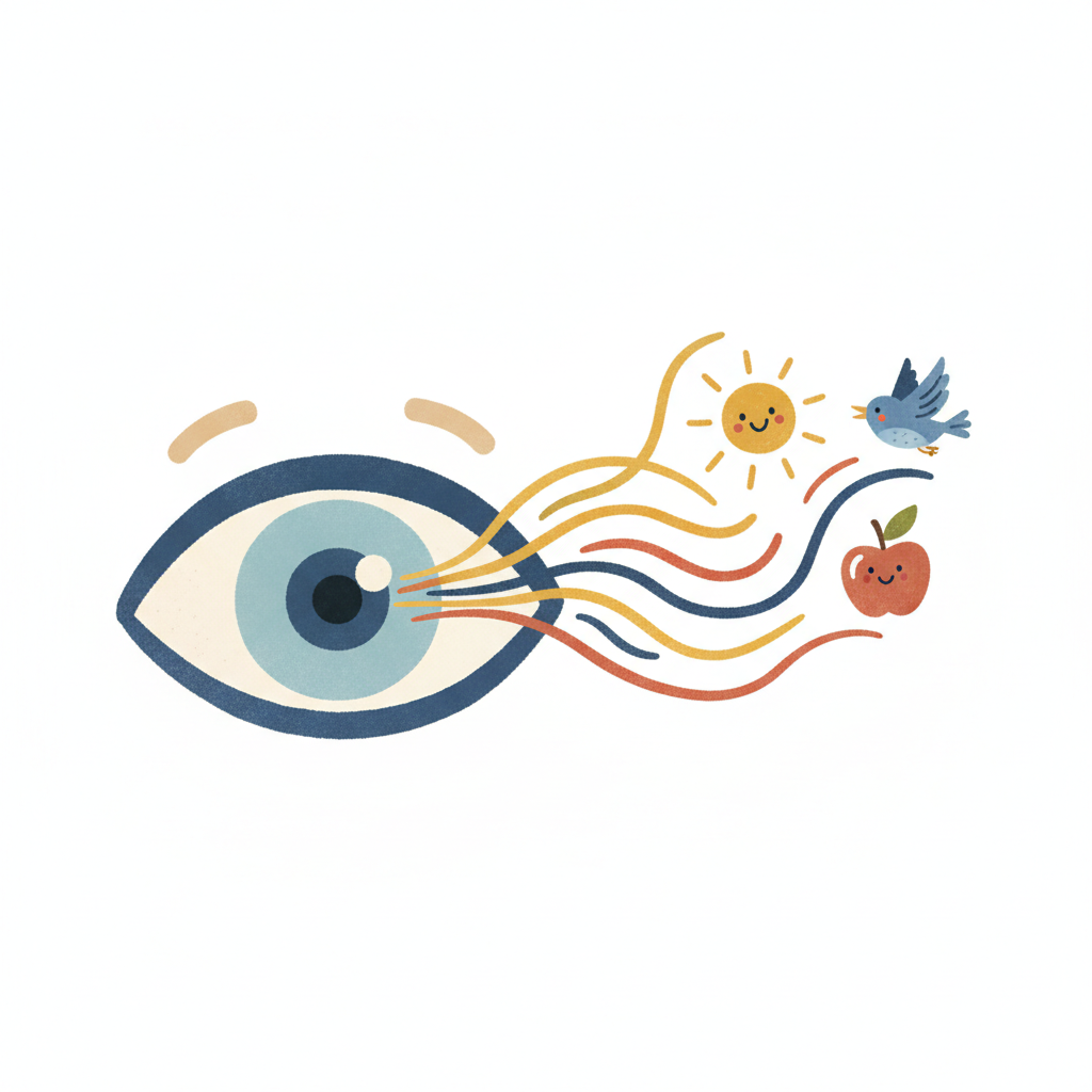 Illustration eines Auges, das Sonne, Vogel und Apfel durch bunte Linien wahrnimmt.