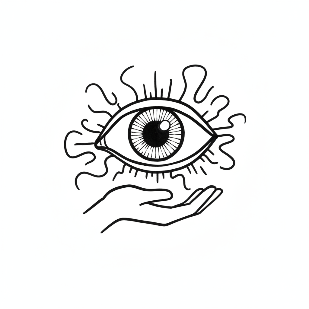 Schwarz-weiße Linienzeichnung eines mystischen Auges mit Strahlen, das von einer Hand gehalten wird.