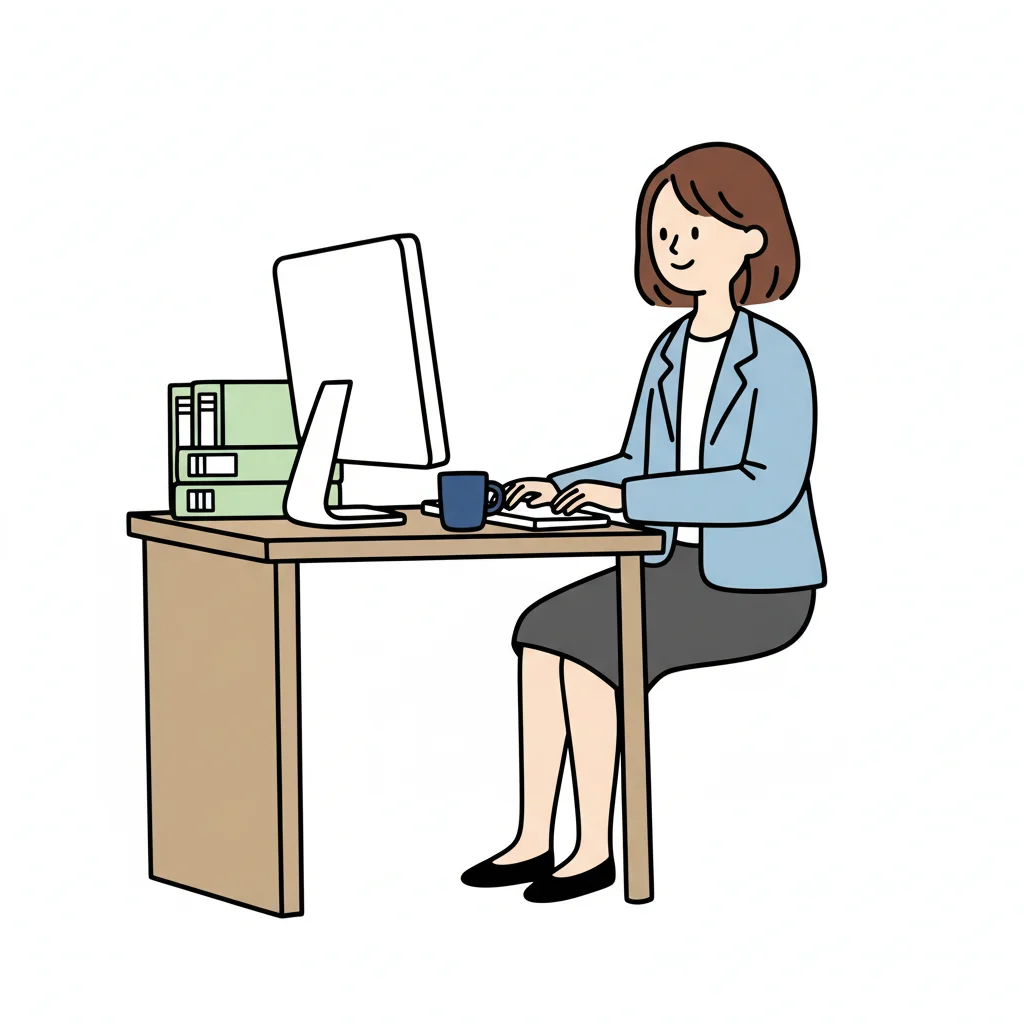 Eine Frau sitzt an einem Schreibtisch mit Computer und Tassen.
