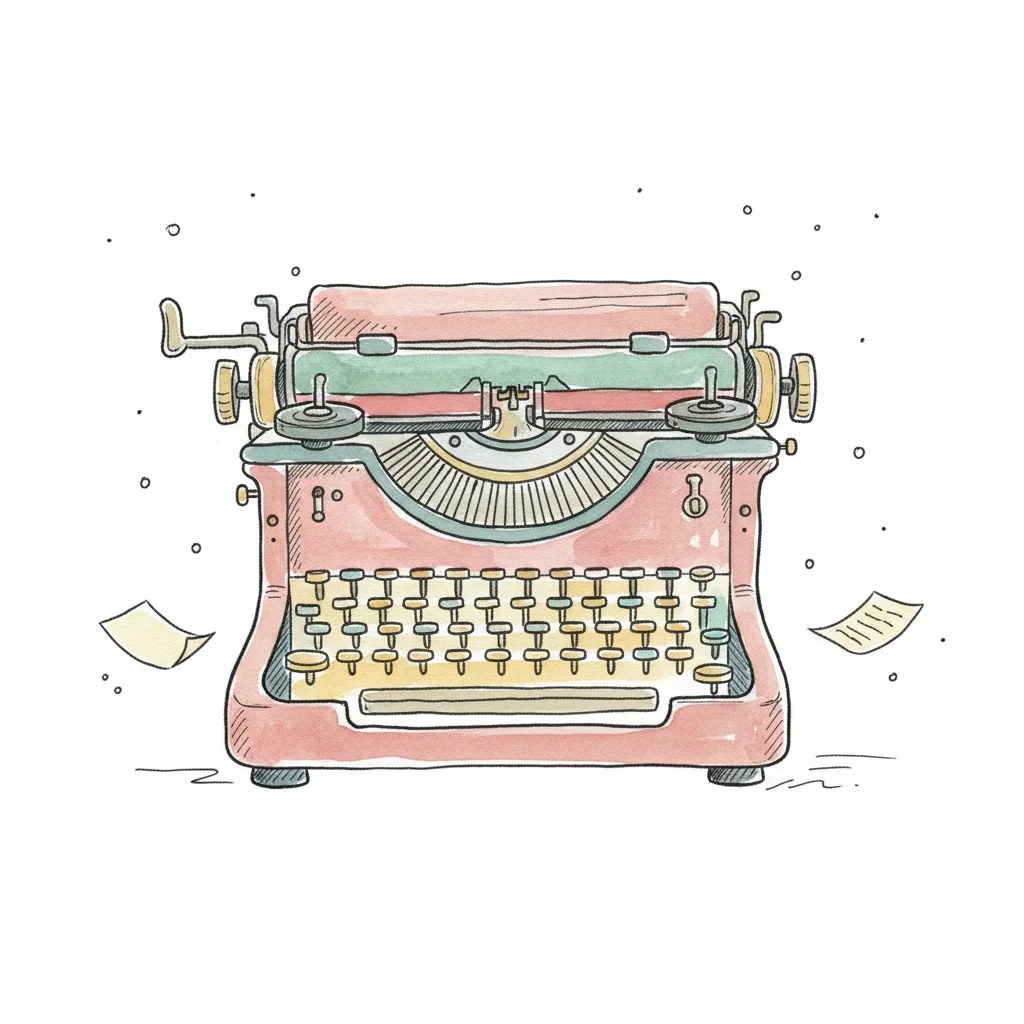Eine rosa Schreibmaschine mit fliegenden Blättern im Hintergrund.