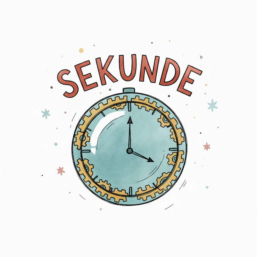 Aquarell-Illustration einer Uhr mit sichtbaren Zahnrädern und dem Wort 'SEKUNDE' darüber.
