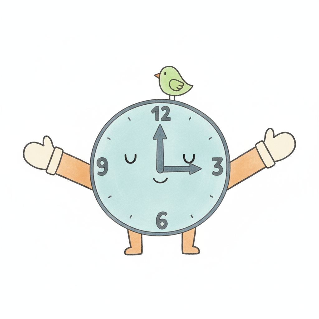 Niedliche Cartoon-Uhr mit Gesicht, Armen, Fäustlingen und einem Vogel auf dem Kopf.