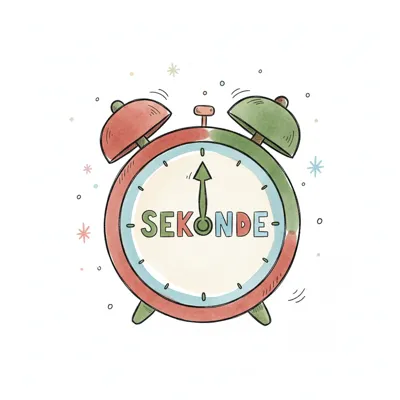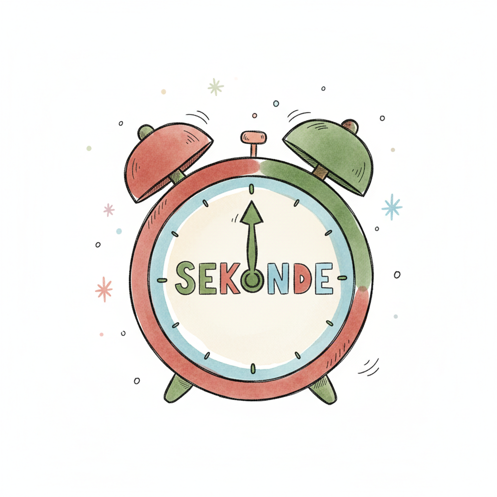 Bunter Aquarell-Wecker mit dem Wort 'SEKUNDE' auf dem Zifferblatt, Zeiger auf 12.
