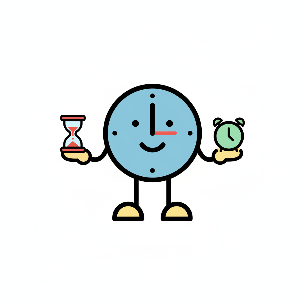 Freundliche Cartoon-Uhr hält Sanduhr und Wecker in den Händen.
