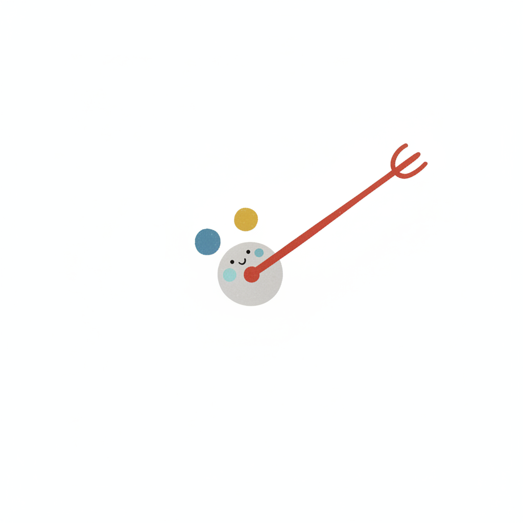 Niedliche Cartoon-Illustration eines lächelnden Kreises mit Gabel und zwei bunten Punkten.