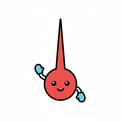 Niedlicher roter Cartoon-Charakter mit spitzem Kopf, lächelndem Gesicht und blauen Fäustlingen winkt.