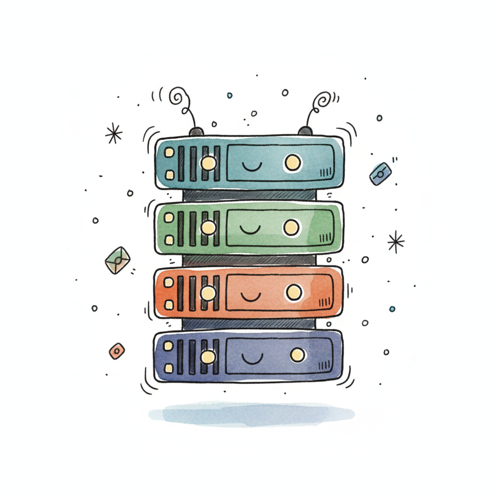 Vier lächelnde, bunte Server-Racks mit Antennen und schwebenden Elementen im Cartoon-Stil.
