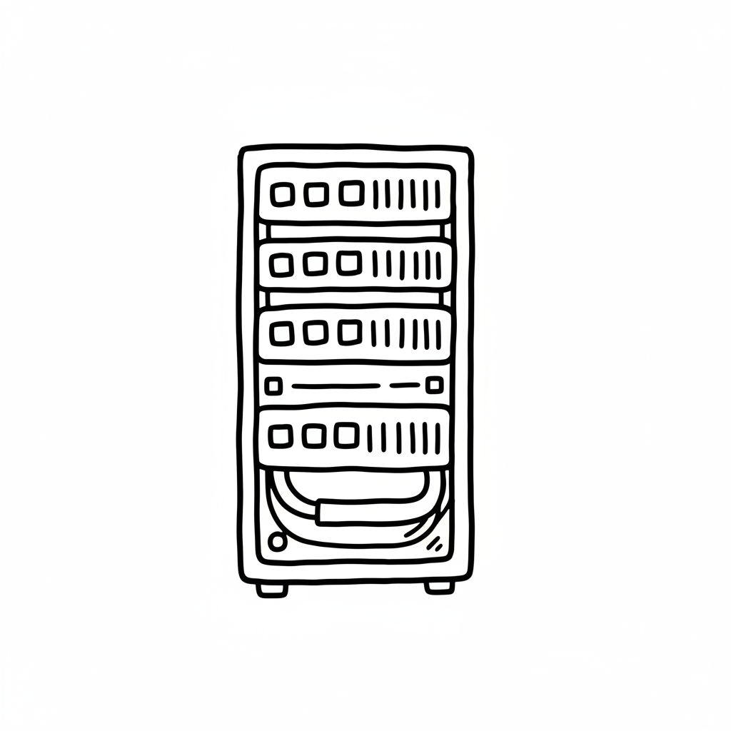 Handgezeichnetes Bild eines Serverschranks mit mehreren Servern und Kabeln.
