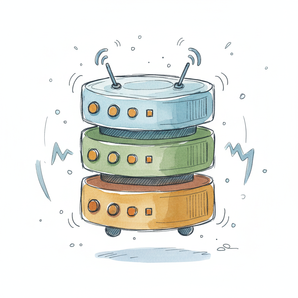 Illustration: Drei gestapelte, farbige Netzwerkgeräte mit Antennen und WLAN-Signal, vibrierend.