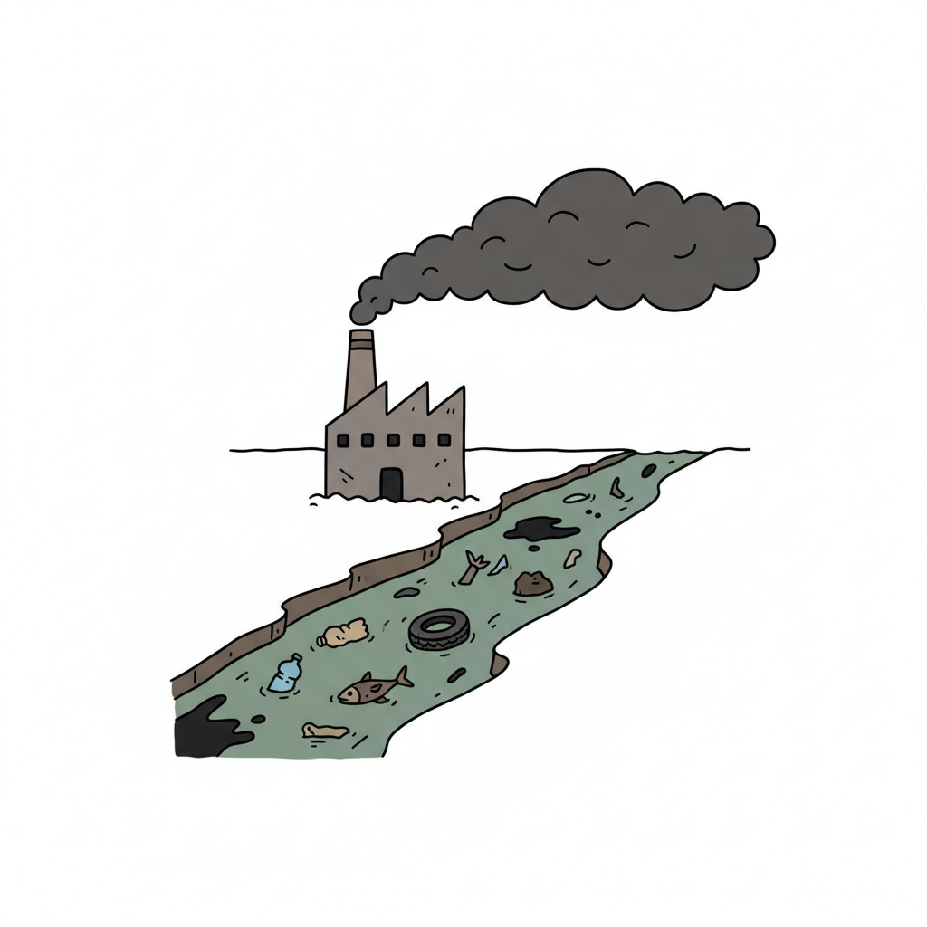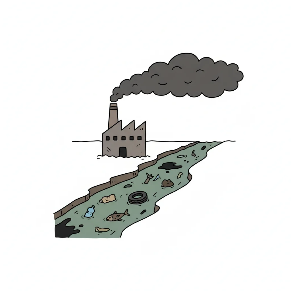 Fabrik verschmutzt Fluss mit Rauch und Müll, was zu Umweltzerstörung führt.