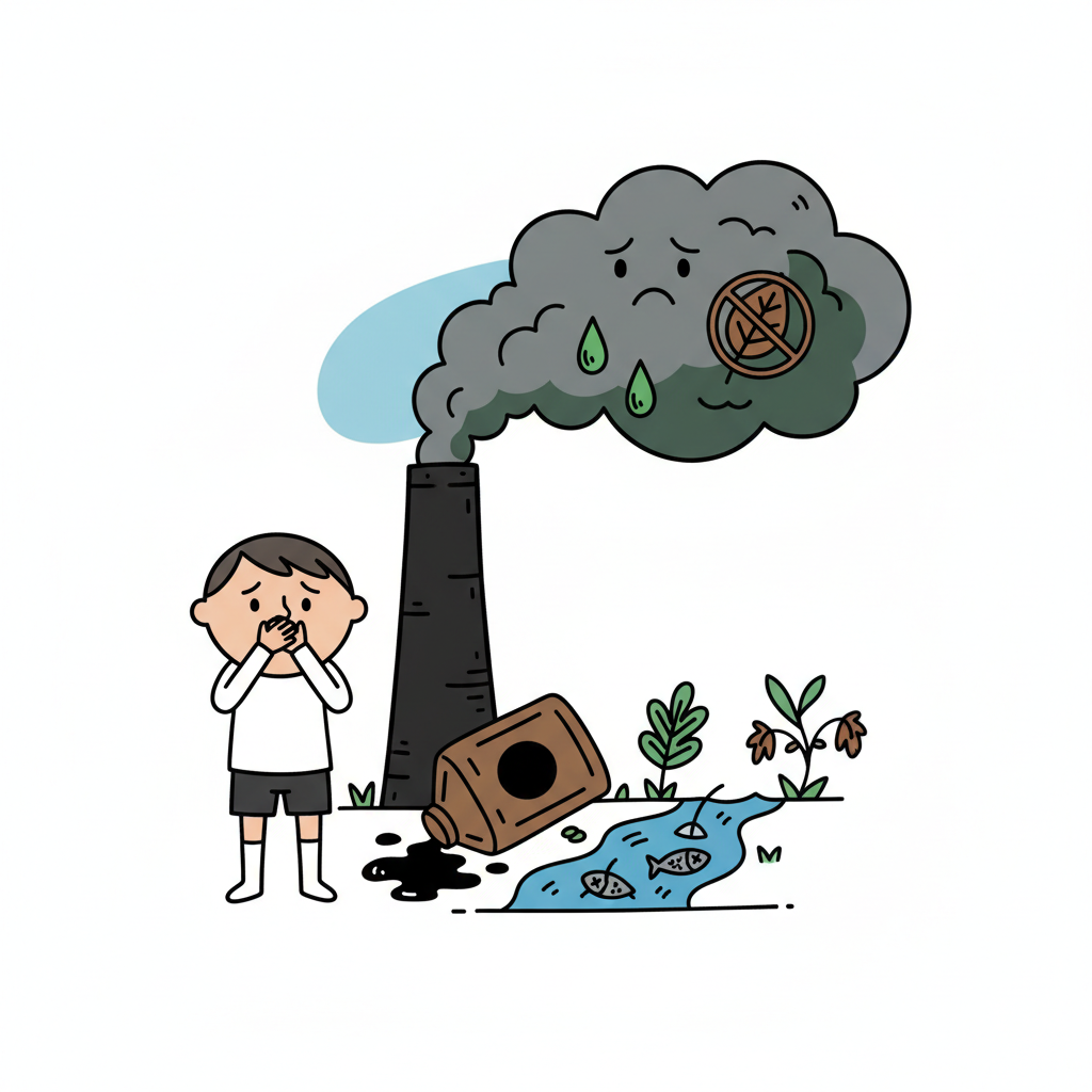 Kind leidet unter Umweltverschmutzung: Fabrikrauch, Öl im Fluss, tote Fische.