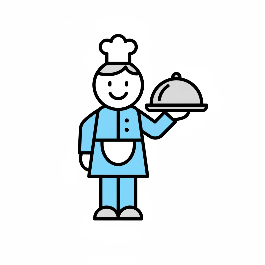 Icon eines lächelnden Kochs/Kellners in blauer Uniform, der eine Servierplatte hält.