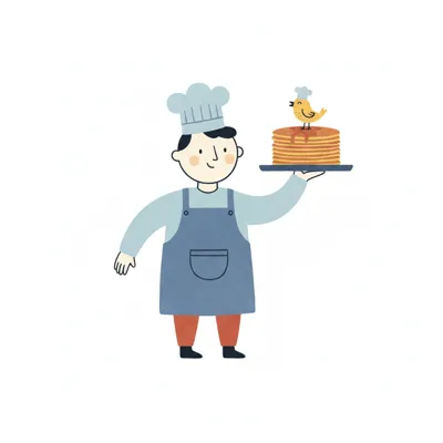 Ein lächelnder Koch serviert Pfannkuchen mit einem kleinen Vogel in Kochmütze auf einem Tablett.