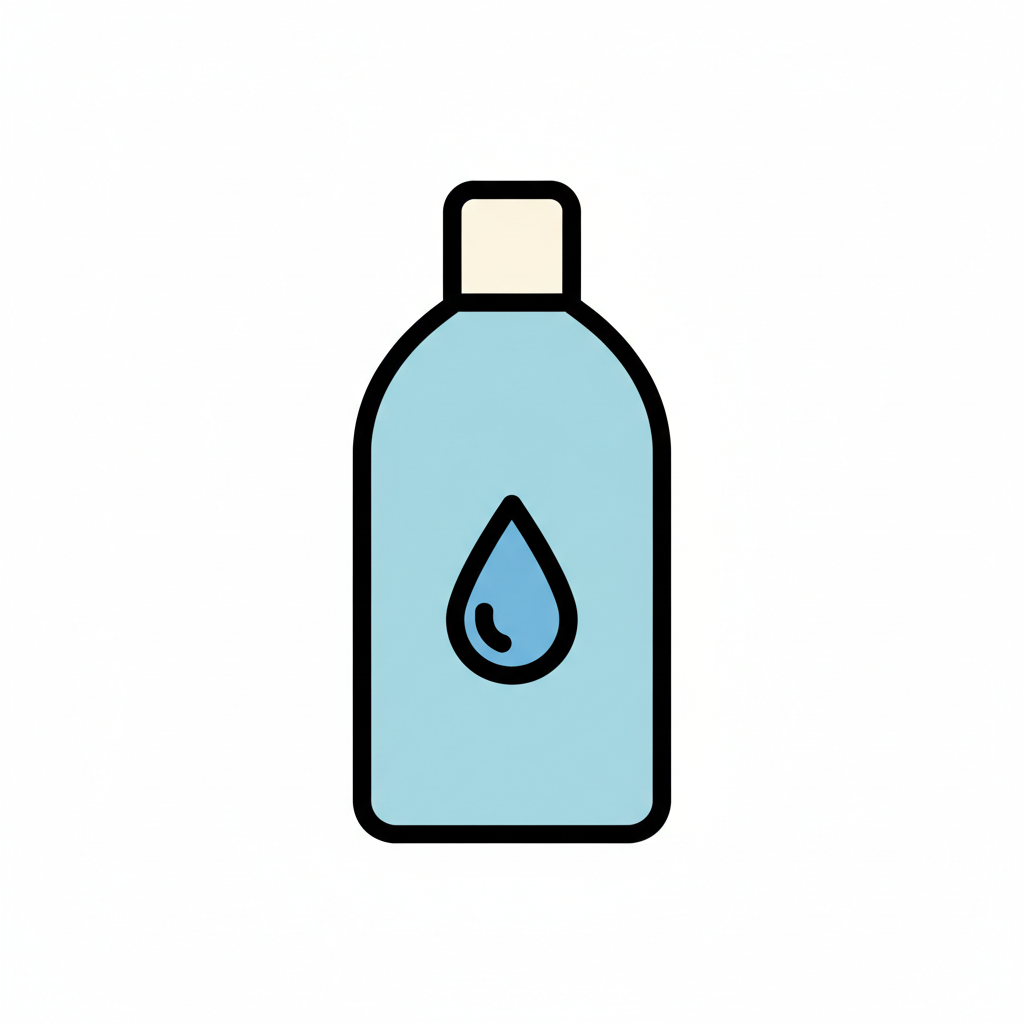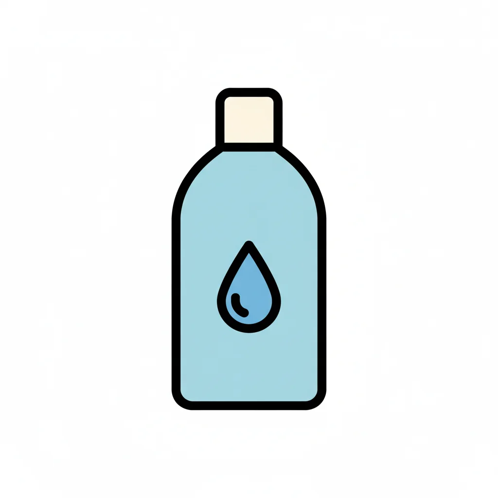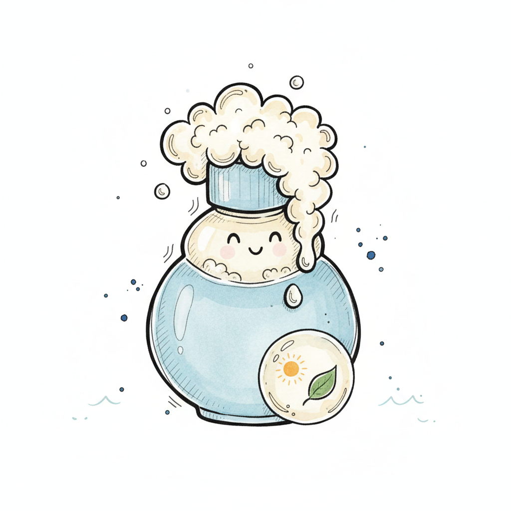 Flasche mit lächelnder Wolke und Blasen, kindlich und freundlich gestaltet.